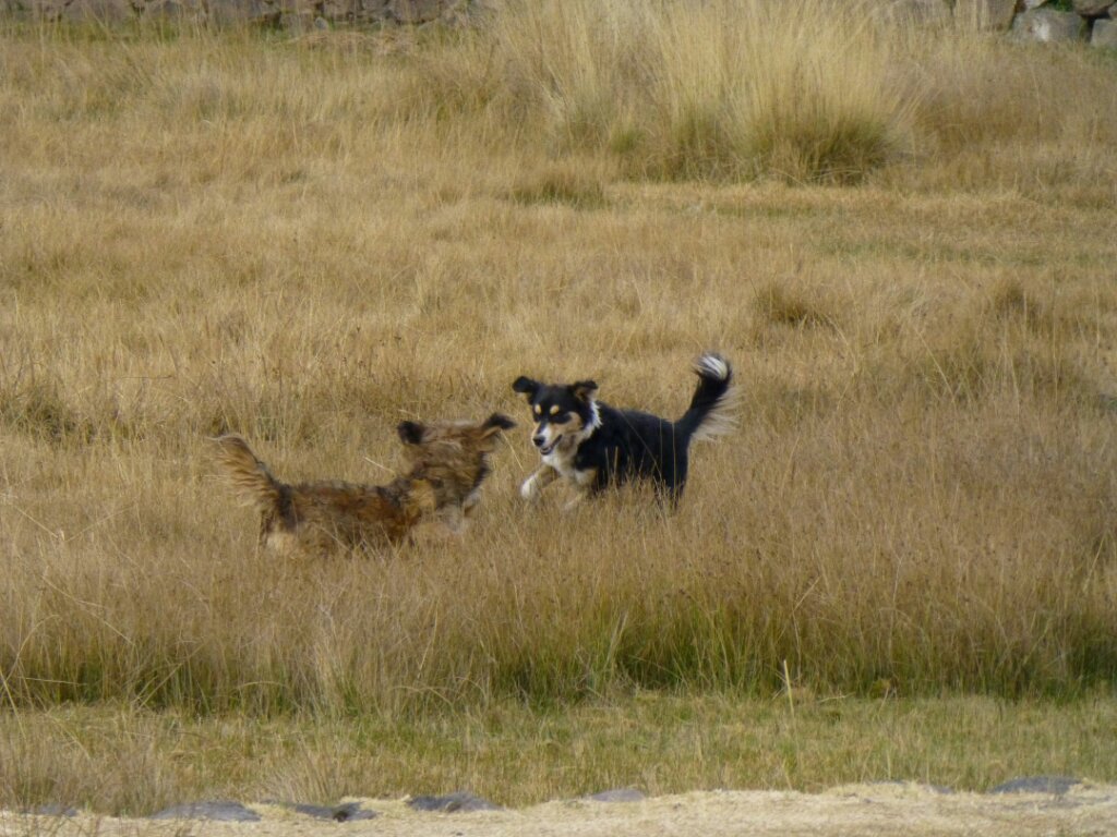 Stavolta l’agguato dei cani è preparato alla perfezione: mi vedono arrivare da lontano, ma non ho possibilità di scampo, l’unica è passargli davanti su questo stretto viottolo. Uno salta fuori dal fossato a fianco del sentiero, due mi corrono a fianco, a pochi centimetri. Per fortuna riesco a non cadere, pur guidando su pietre sul fondo sabbioso, però per sicurezza alzo le gambe. Mi hanno veramente stancato questi cani randagi.