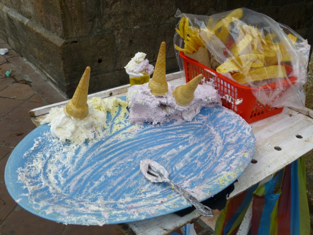 Ceno in un piccolo ristorante con un anziano cuoco molto simpatico. Il pesce è il solito guazzabuglio di sapori che tanto piace qui: pescado fritto (e non è dato sapere esattamente che tipo di pesce è), coperto di una salsa con mille spezie che annega pesce e un misto di frutti di mare tagliuzzati. Riso in bianco, insalata di cipolle (tante) e lattuga (tracce) e platano fritto. Domani chiedo tutto alla griglia, senza salse! Pochi sapori e chiari! Da bere, solito succo di frutta fresco, oggi lime.