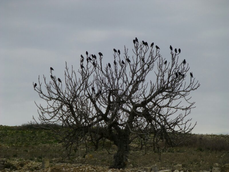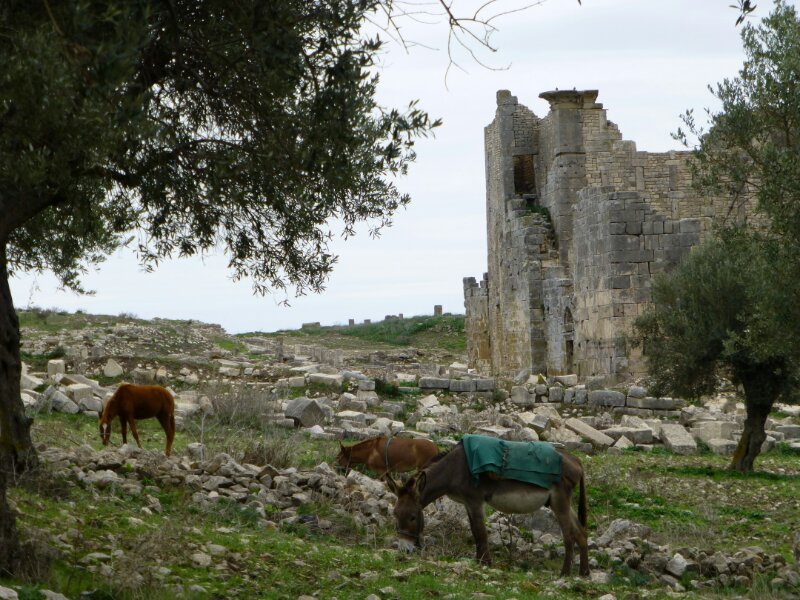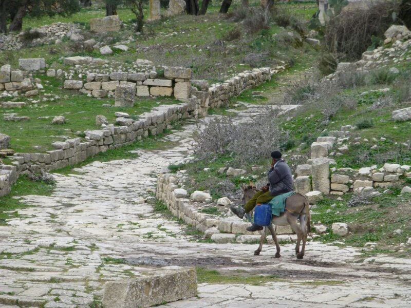 Le rovine sono splendide, sparse su alcune colline coperte di ulivi. Alcune donne, tra l’altro, stanno raccogliendo le olive in ampi teli. Tutto a mano, non c’è ombra di mezzo meccanico o strumento per far cadere le olive dai rami.