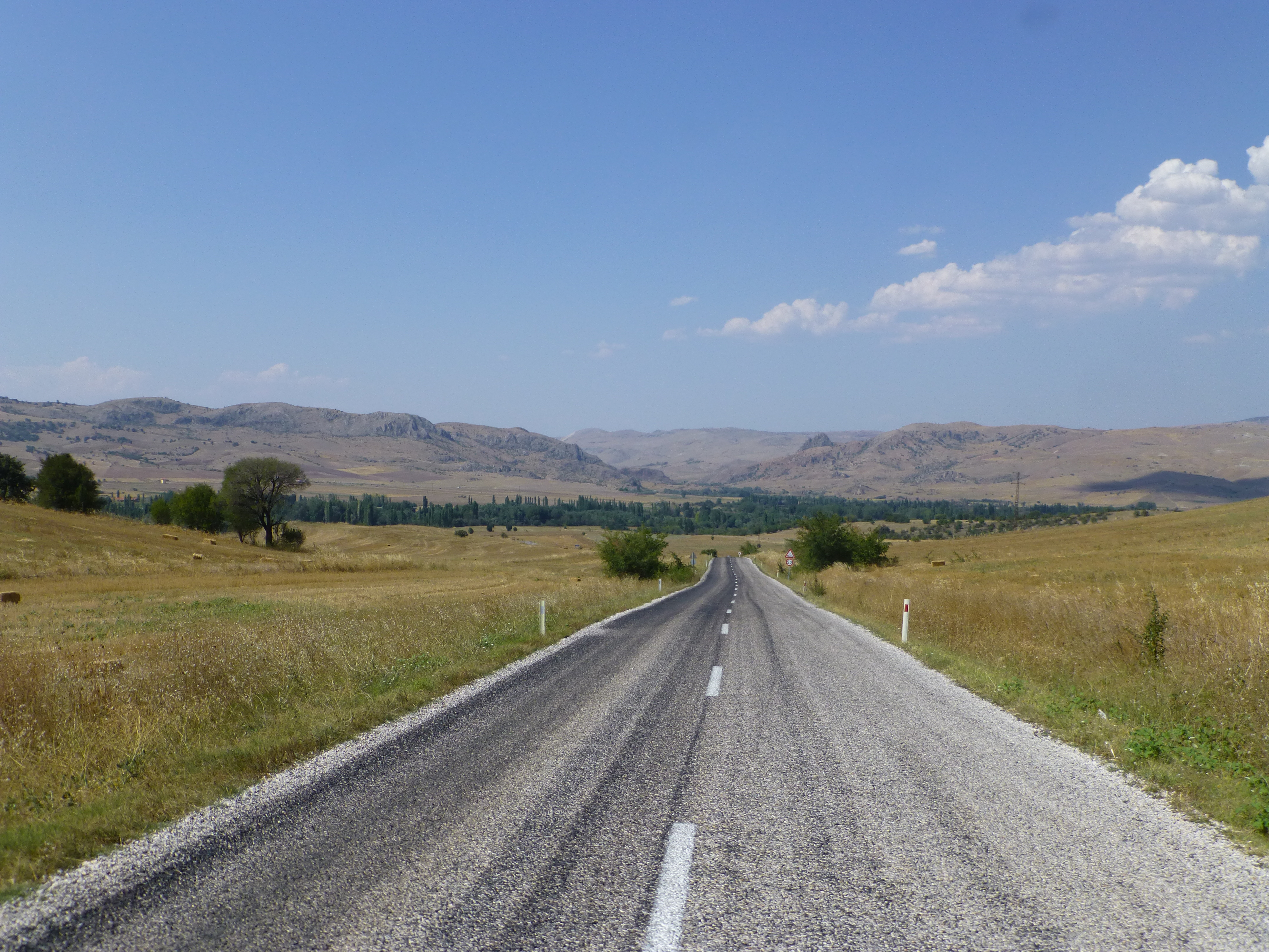 Visto che Amasya e Hattusa sono molto vicine, mi sono inventato una deviazione su strade minori che si rivela molto bella per i paesaggi e la temperatura (che scende, visto che la strada sale di quota di alcune centinaia di metri), ma, c’era da aspettarselo, non eccezionale per il fondo stradale, davvero scivoloso per via del catrame praticamente sciolto e del brecciolino sempre abbondante.