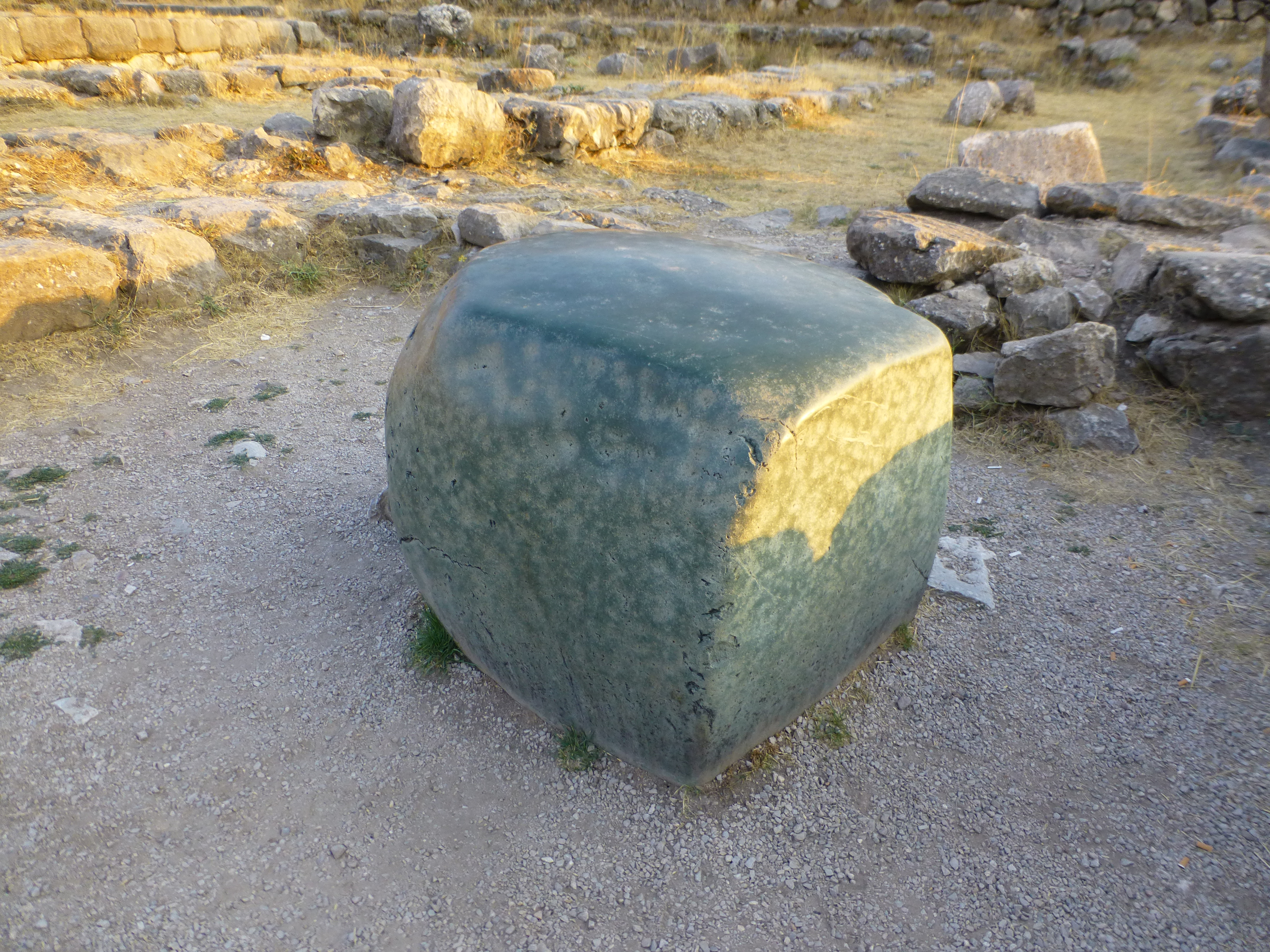 Mi mostra una grande pietra verde, splendida. Era un altare, ma cosa ci sacrificavano o celebravano non é dato sapere.