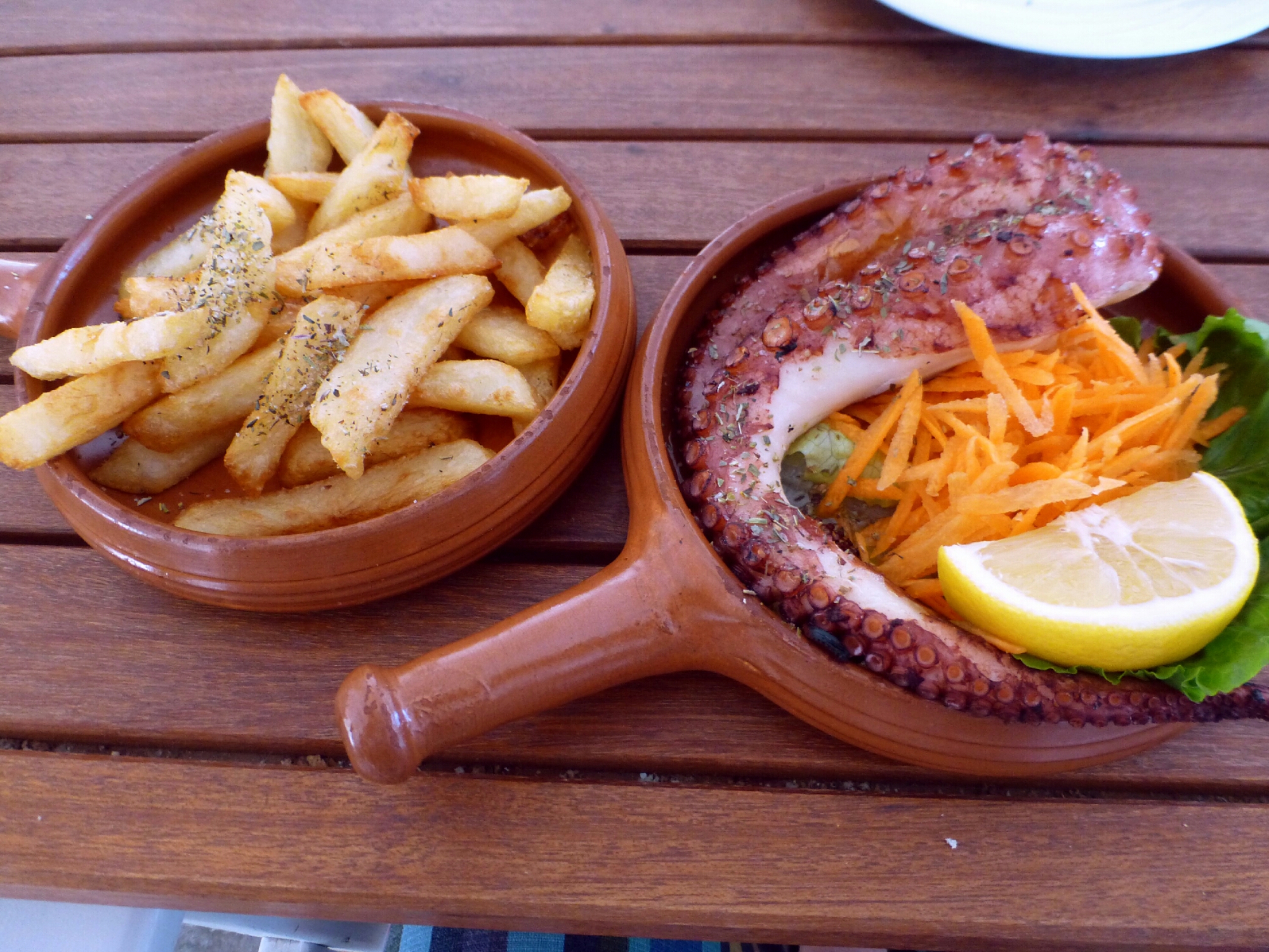 Cambiamo spiaggia intorno all’ora di pranzo, in tempo per mangiare un bell’octopus alla griglia con patate fritte di contorno e l’immancabile insalata greca.